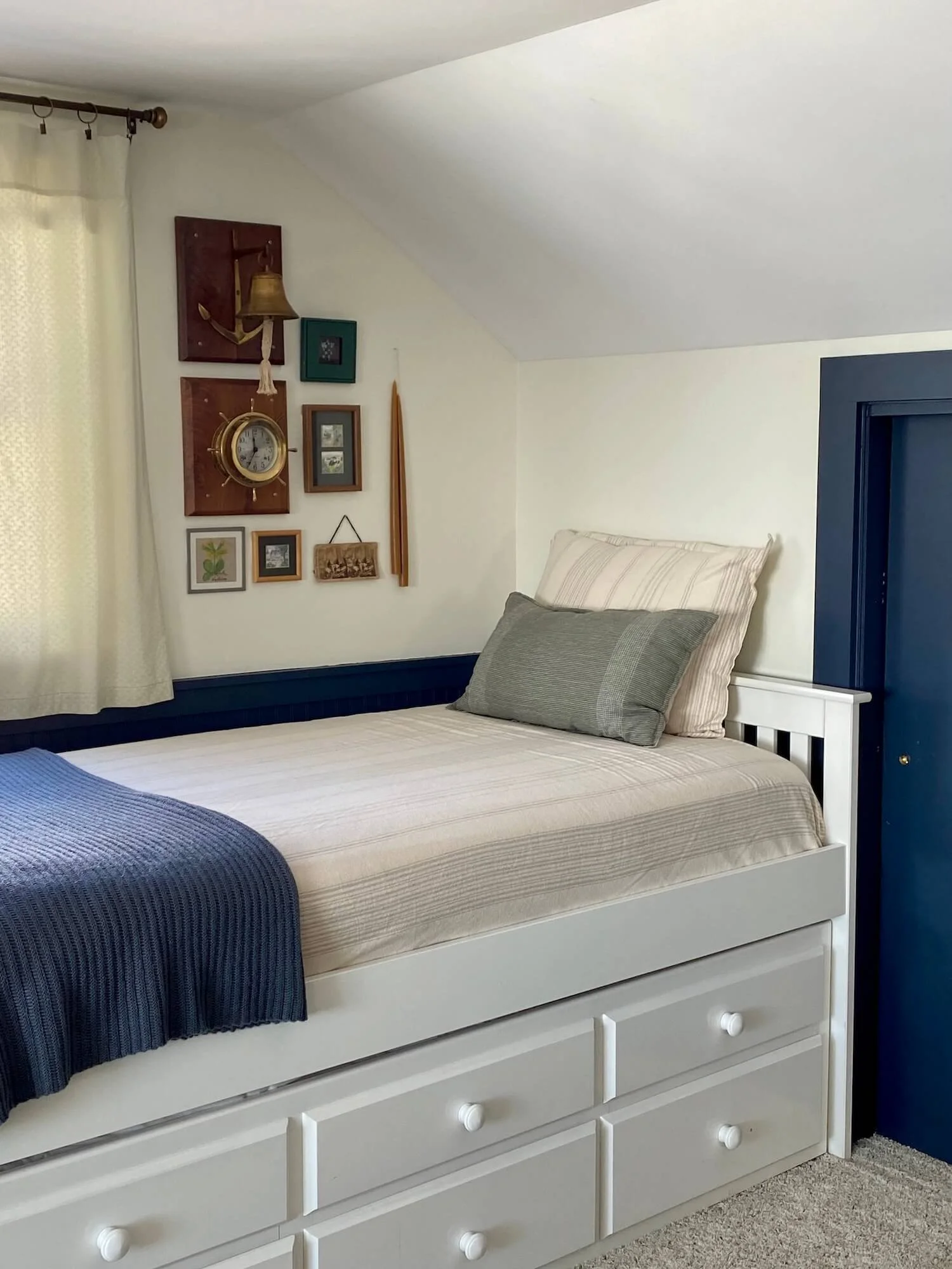 The client is bold, fun-loving and unafraid of color and pattern. She wanted the room to feel grown up but not stuffy; nautical but not over the top; cottage-y yet still refined. Her vision was to have an inspiring, peaceful respite from her busy life in Chicago. This room represents an escape to a slower, more peaceful pace of life, with a nod to the history of the lake’s original cottages. This is an incredibly special place for the client, as she grew up here and has some of her fondest memories here.