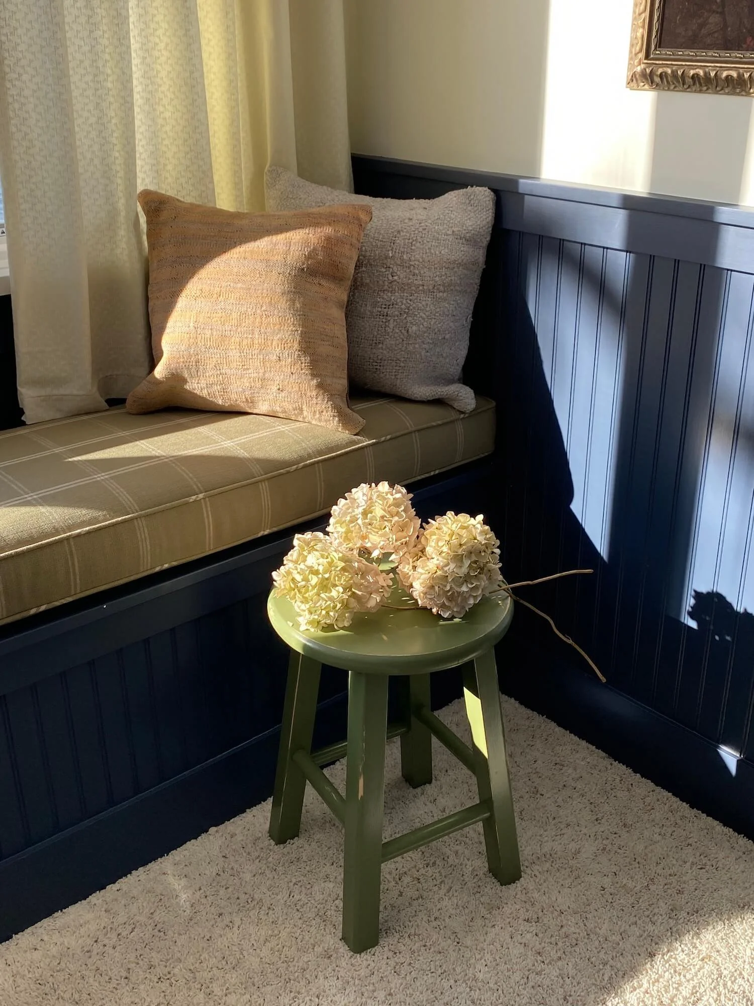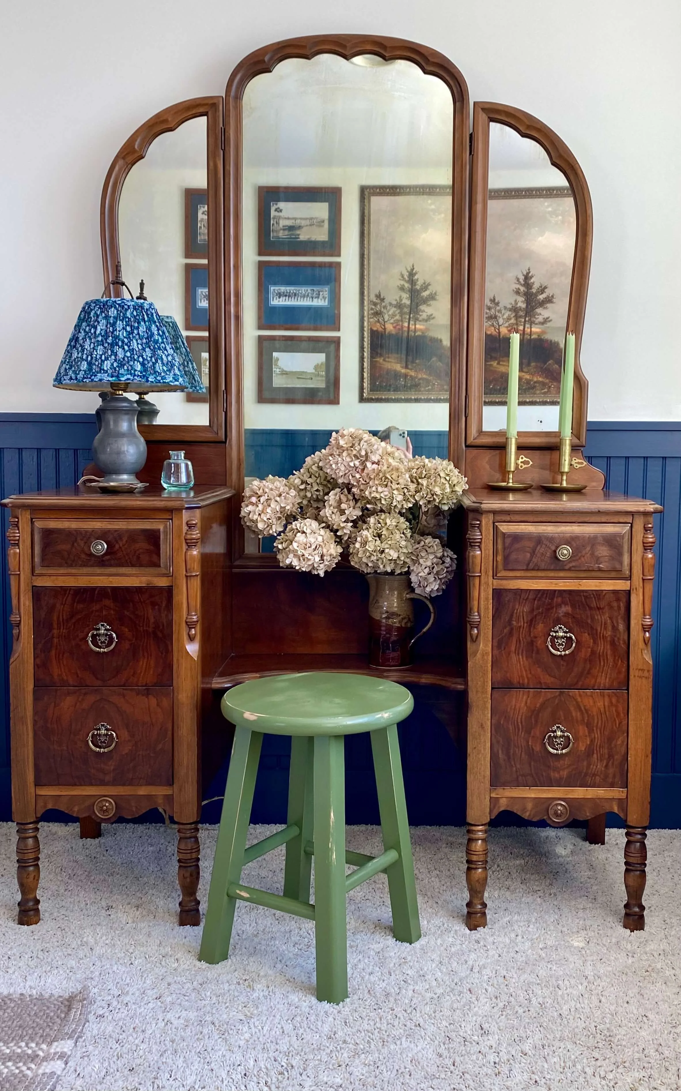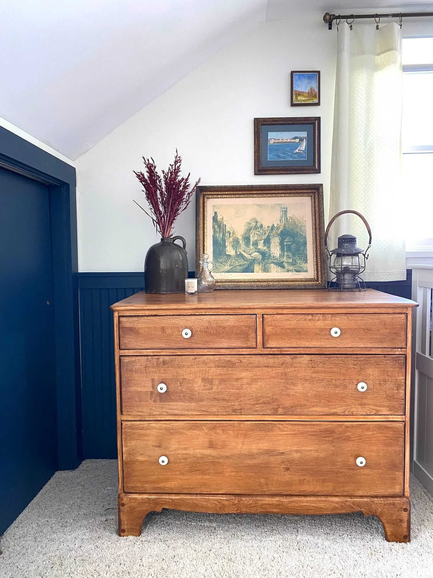 This lake house bedroom needed a full fledged cosmetic update as it felt rather juvenile for its now adult inhabitant. The bedroom was last designed for the client when she was in her early teens in the 2000s, so the room needed to grow up, just as she had. The room itself has excellent bones, such as the beadboard, the window seat looking out onto the lake and some excellent vintage pieces, so I came in and gave the room a much needed glow up.